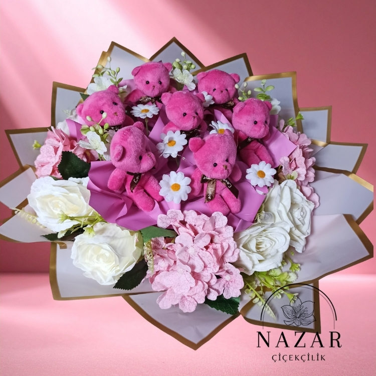 "7 Ayıcıklı Ortanca ve Gül Demeti"