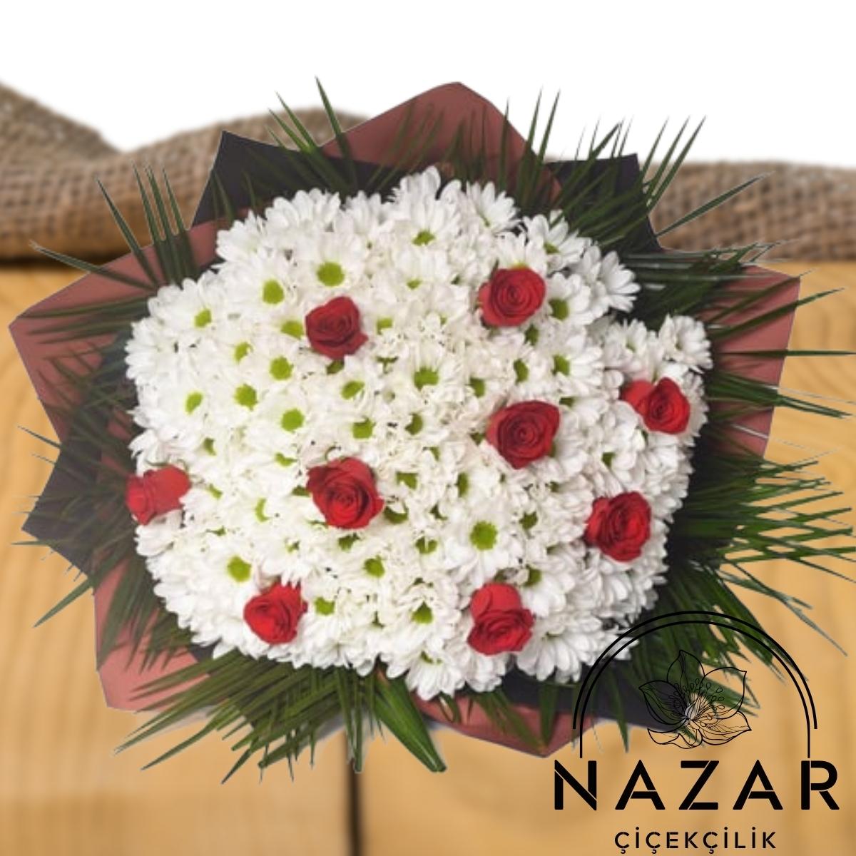 Beyaz Papatyalar ve 9 Adet Kırmızı Gül Buketi