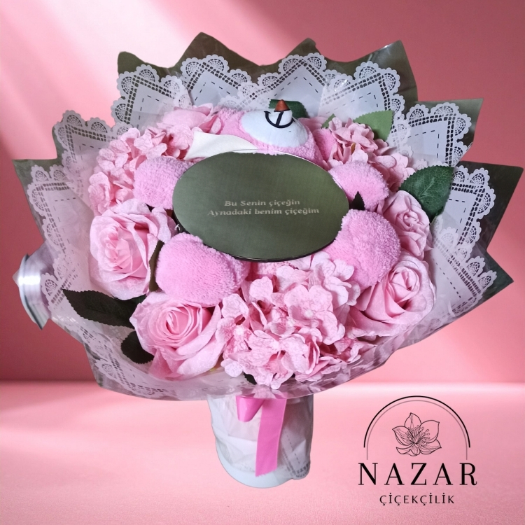 "Pembe Gül Ortanca ve Ayıcık ile Aynalı Demet"